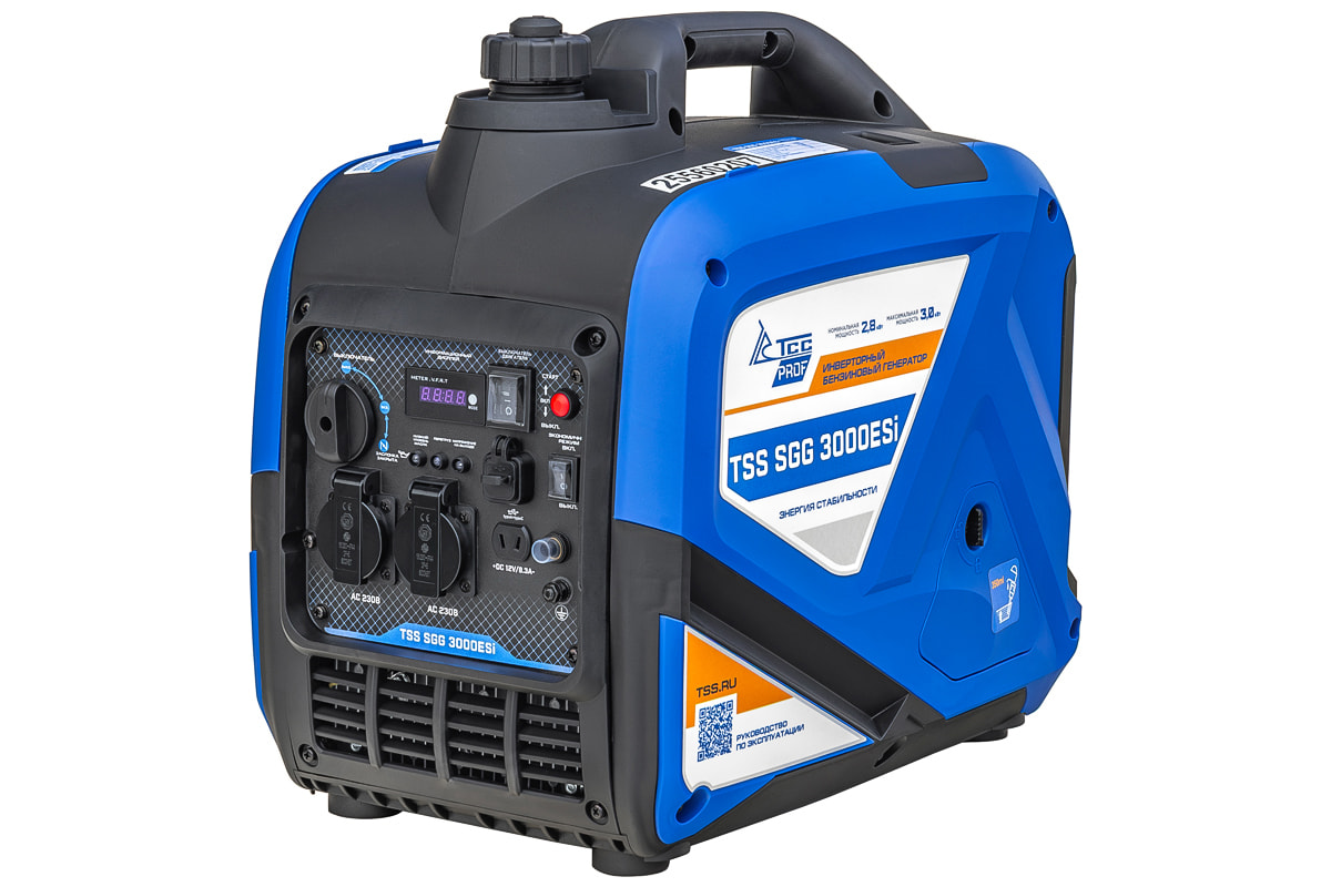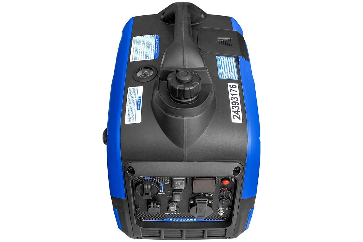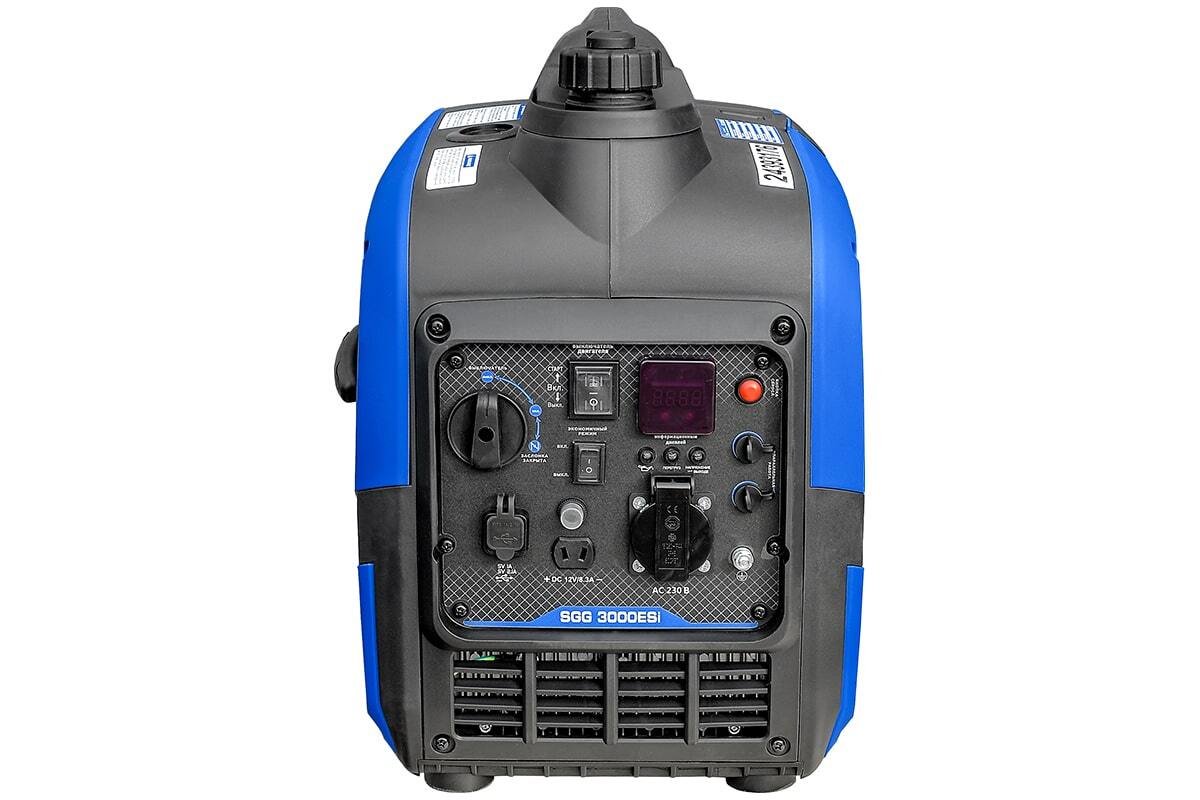 Бензогенератор инверторный SGG 3000ESi в шумопоглащающем кожухe, с электростартером, режимом экономичного расхода топлива - предназначен для подключения к нему потребителей тока общей максимальной мощностью до 3,0 кВт. Переносной компактный инверторный генератор предназначен для питания электроприборов на загородном участке, в походе, на рыбалке.
