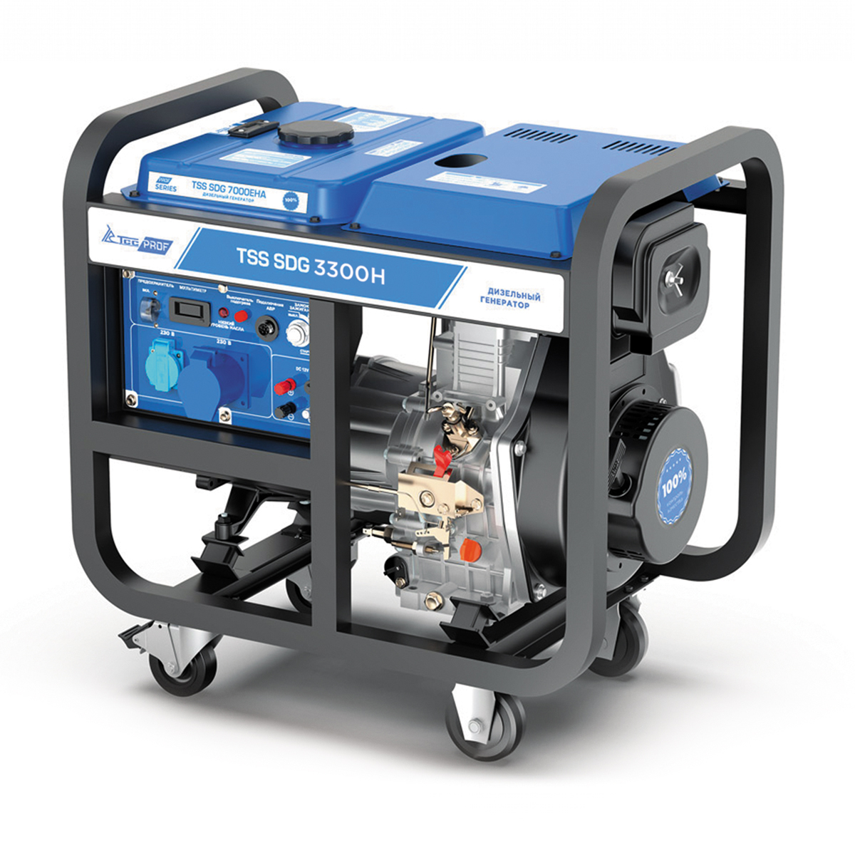 Дизель генератор TSS SDG 3300H с надежным и экономичным двигателем и ручным стартером. Для удобства передвижения оснащенный колесным комплектом. Область применения: Применяются в коммерческих и социальных организациях, специальных службах, частном секторе, можно использовать генератор для загородного дома, дачи. строительство и торговля; сервисные и аварийные службы; туризм и отдых; частные домовладения. Особенности конструкции: двигатель одноцилиндровый четырехтактный, с воздушным типом охлаждения; Электронные регуляторы напряжения обеспечивают высокий уровень стабильности выходного напряжения и устойчивость к перегрузкам. Для защиты от перегрузок и короткого замыкания применяется тепловой автоматический выключатель; топливный бак увеличенного объема обеспечивает автономную работу агрегата в течение 9-10 часов. Встроенный датчик уровня топлива позволяет осуществлять визуальный контроль остатка топлива в баке. При понижении давления масла ниже допустимого уровня на панели управления загорается сигнальная лампа; в панели управления электростанцией также установлены счетчик моточасов, для однофазных станций 2 розетки для электропитания потребителей 230В, выход питания постоянного тока 12 В и клемма заземления. Гарантийные обязательства и сервисное обслуживание: На дизель генераторы ТСС предоставляется гарантия 12 месяцев. Cеть авторизованных сервисных центров ГК ТСС обеспечивает поставку запасных частей, проведение регламентного технического обслуживания, гарантийного и постгарантийного обслуживания во всех регионах России, что выгодно отличает продукцию ТСС от большинства конкурентов.
