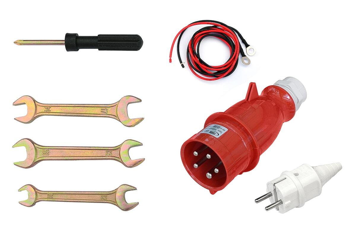 Электрическая вилка, разъем для АВР, предпусковой подогреватель, комплект проводов, колеса.
