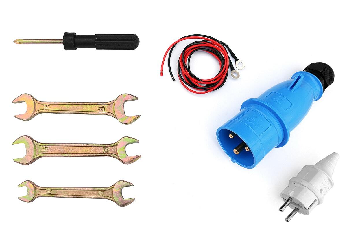 Электрическая вилка, разъем для АВР, предпусковой подогреватель, комплект проводов, ручки и колёса,
